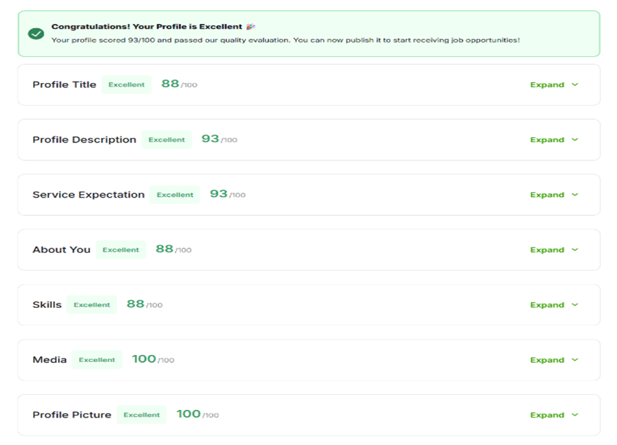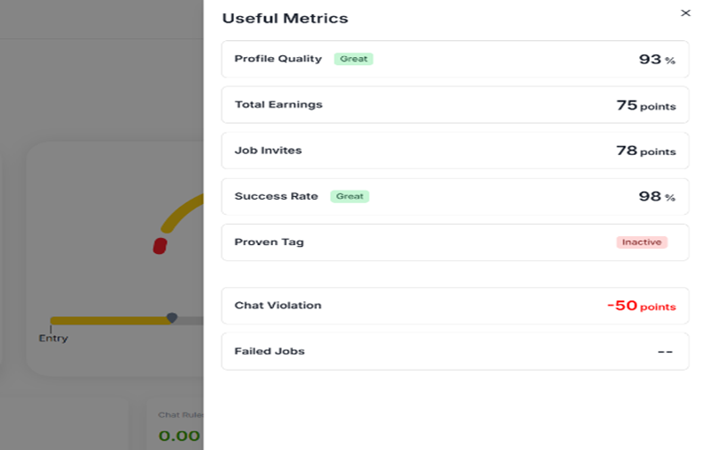 such as your profile quality, total earnings, job invites, success rate, chat