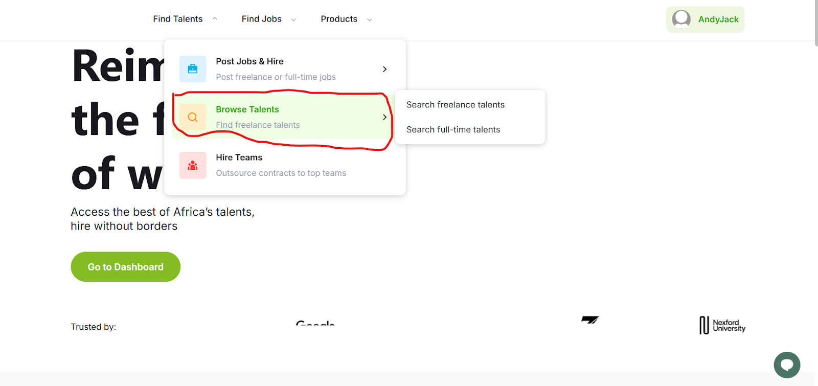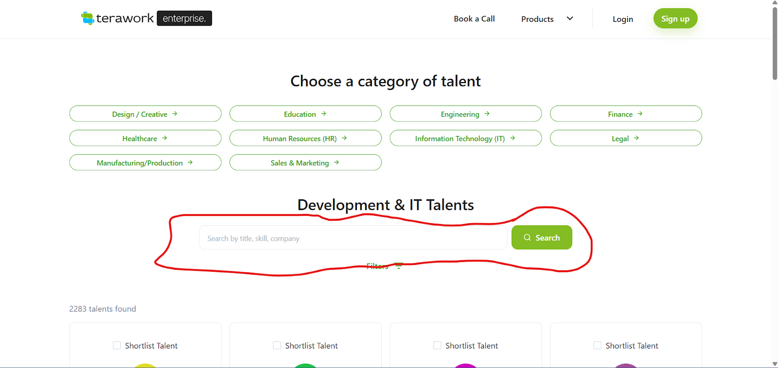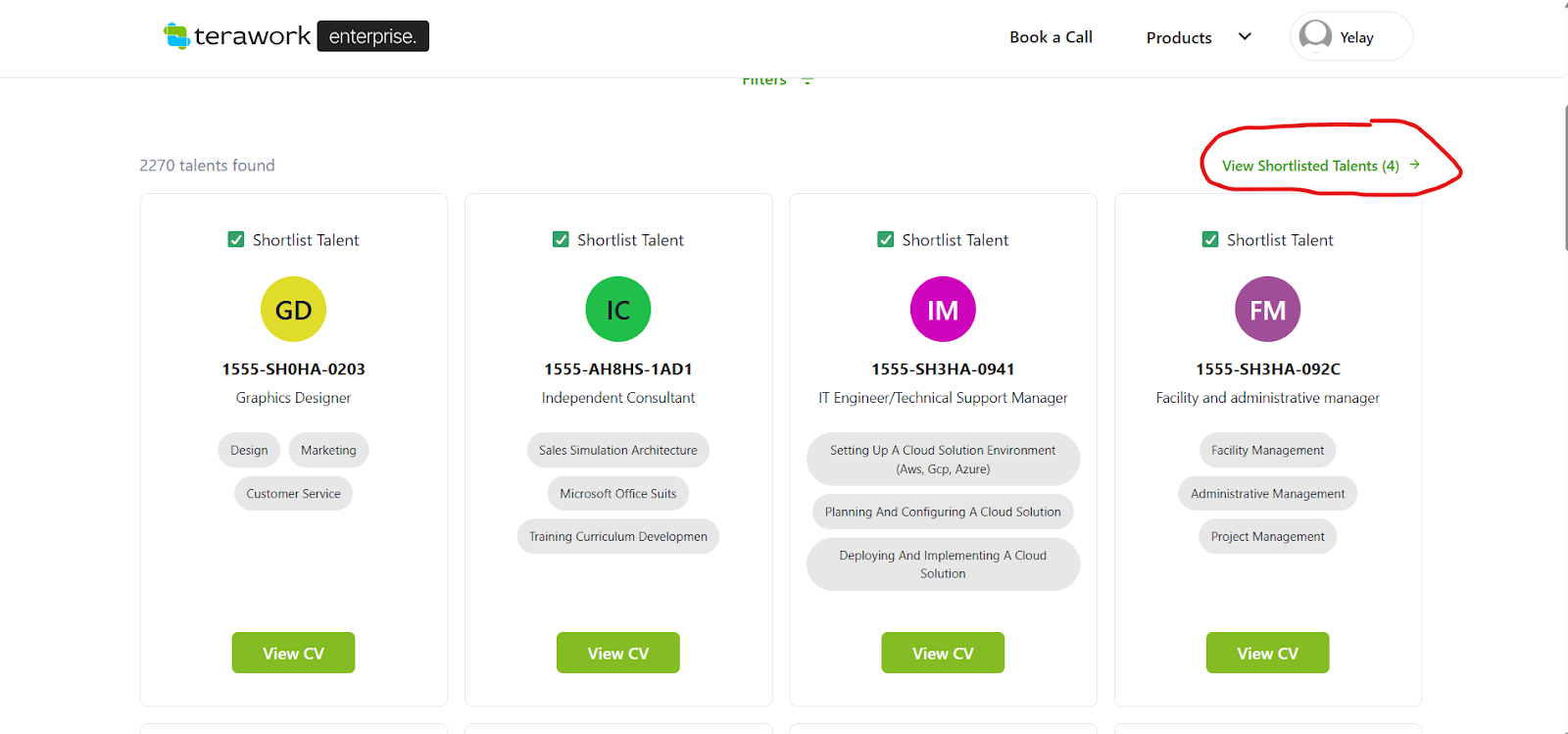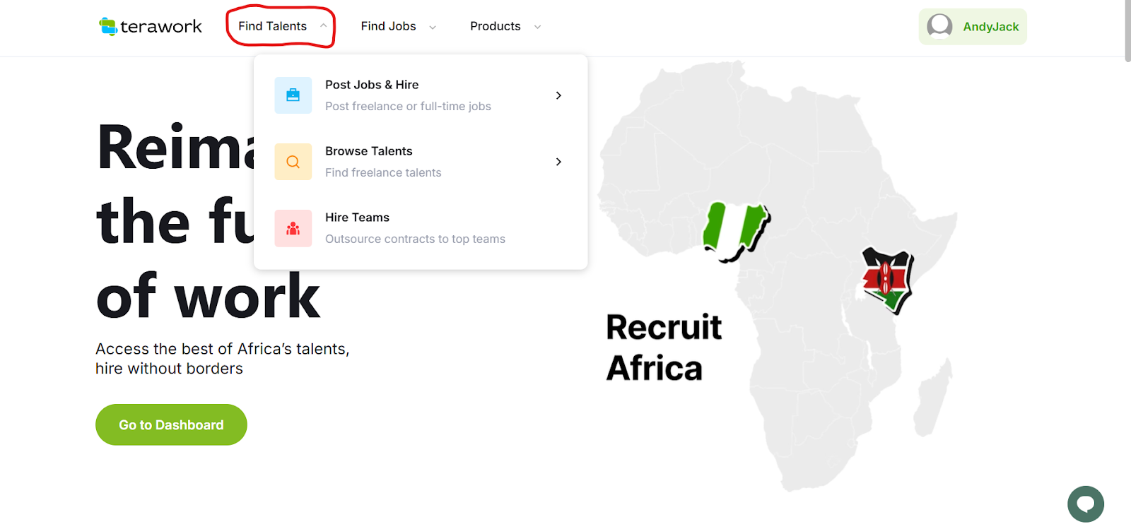 Step 1: Log in to your Terawork account. On the welcome page, click on “Find Talents.”
