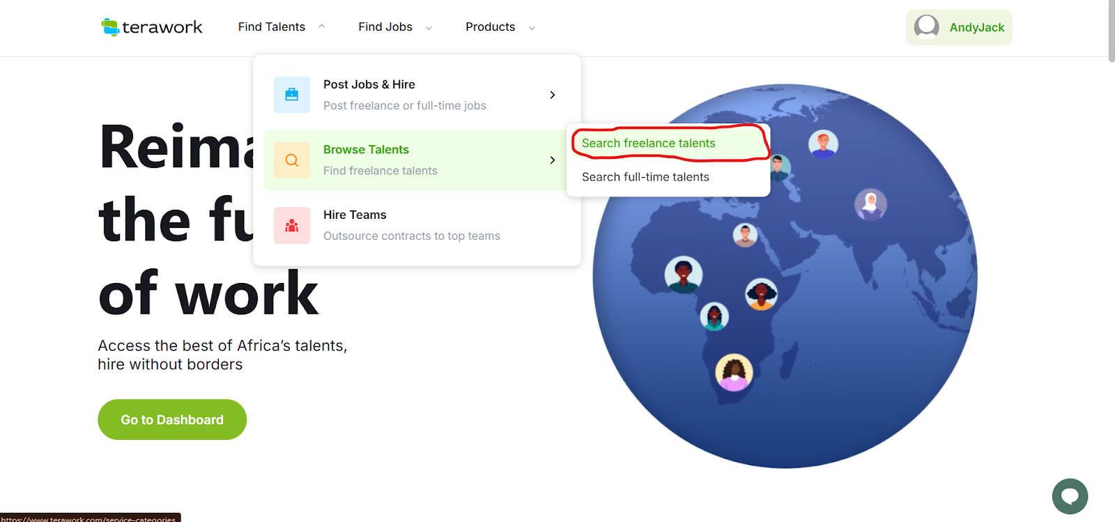 Step 1: Log in to your Terawork account. On the homepage, click on “Find Talents.”