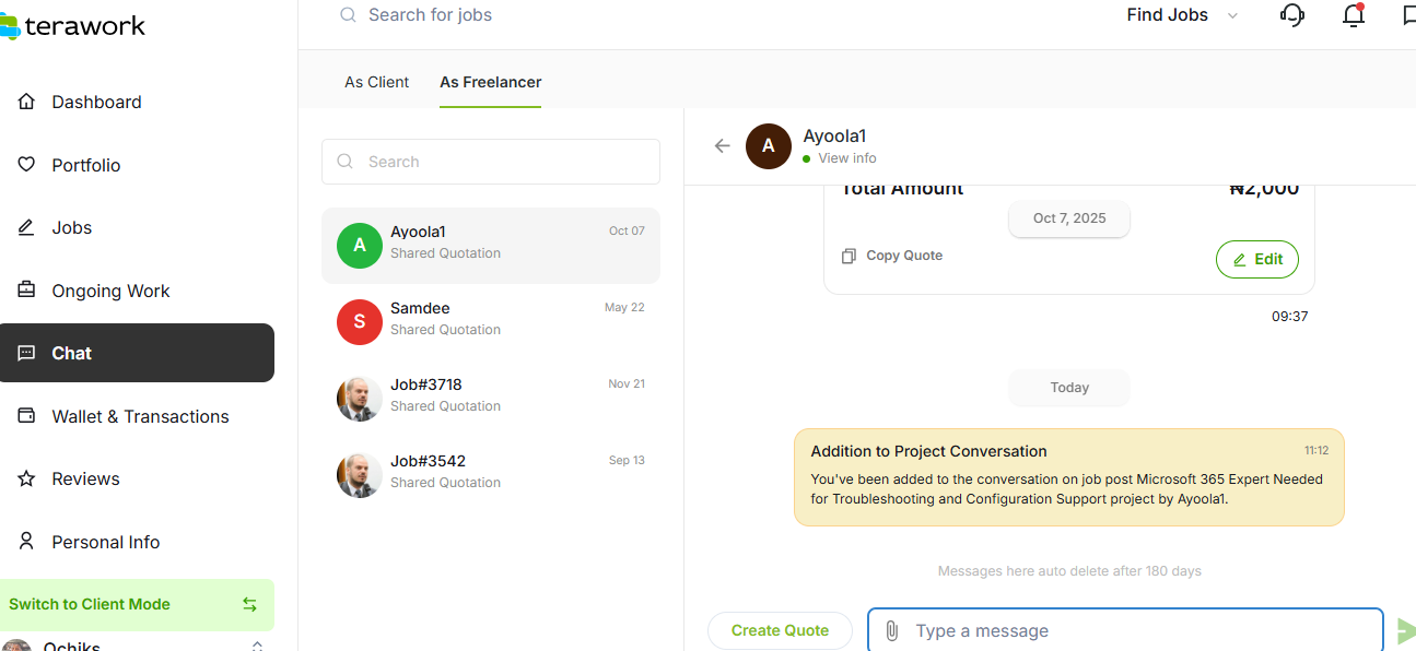 Step 2: After a successful application (i.e., once the customer has accepted your application) or after accepting an invitation, go to the Chat section. Click on the customer’s name, and you’ll see a prompt indicating that you’ve been added to a conversation.