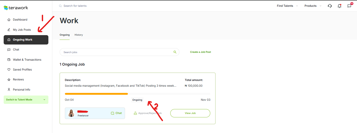 Step 1: Log in to your freelance dashboard through http://www.TERAWORK.com.Step 2: Click on the “Ongoing Works” option on the left-hand side of the screen to view your current ongoing work.