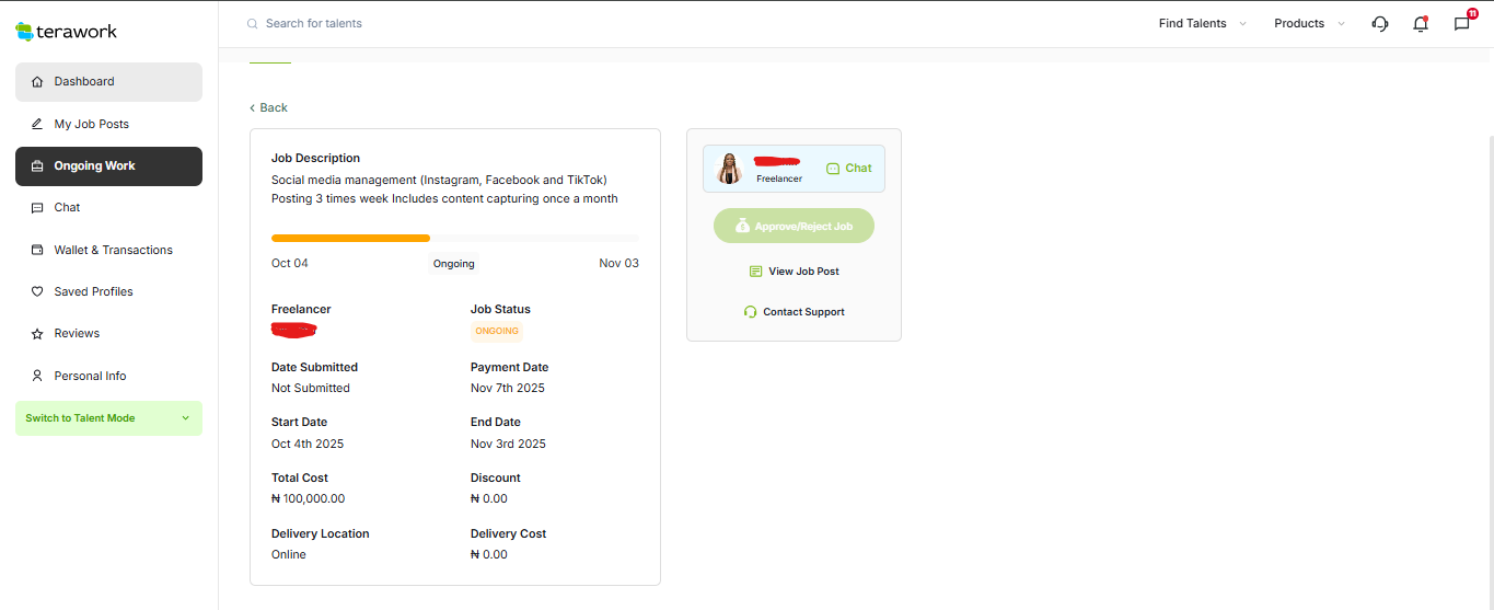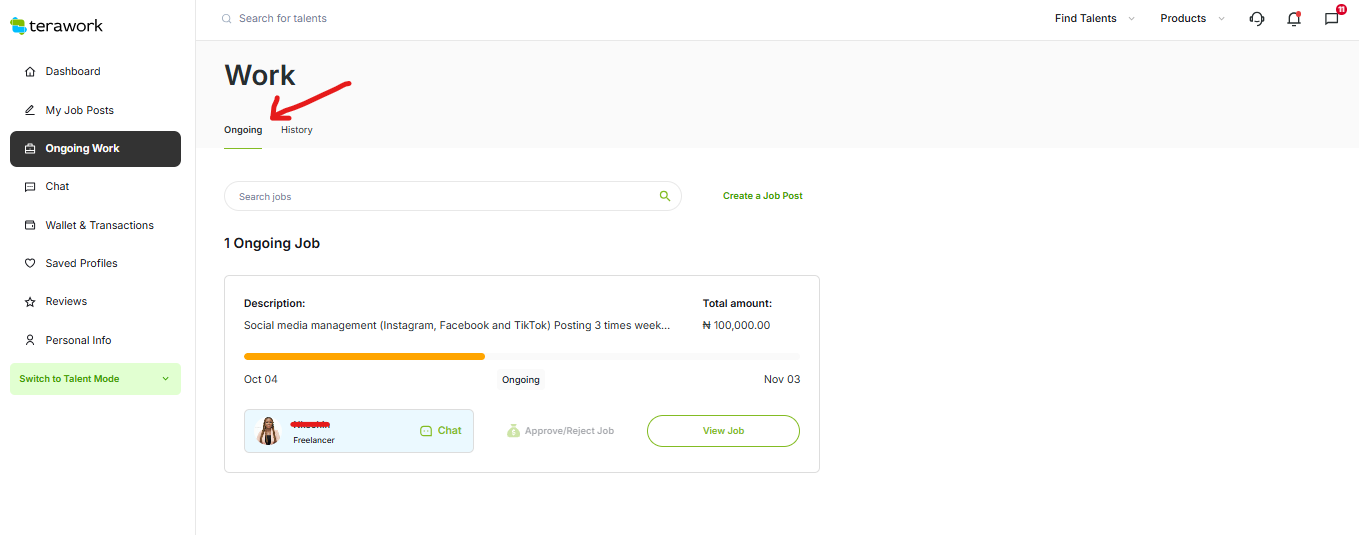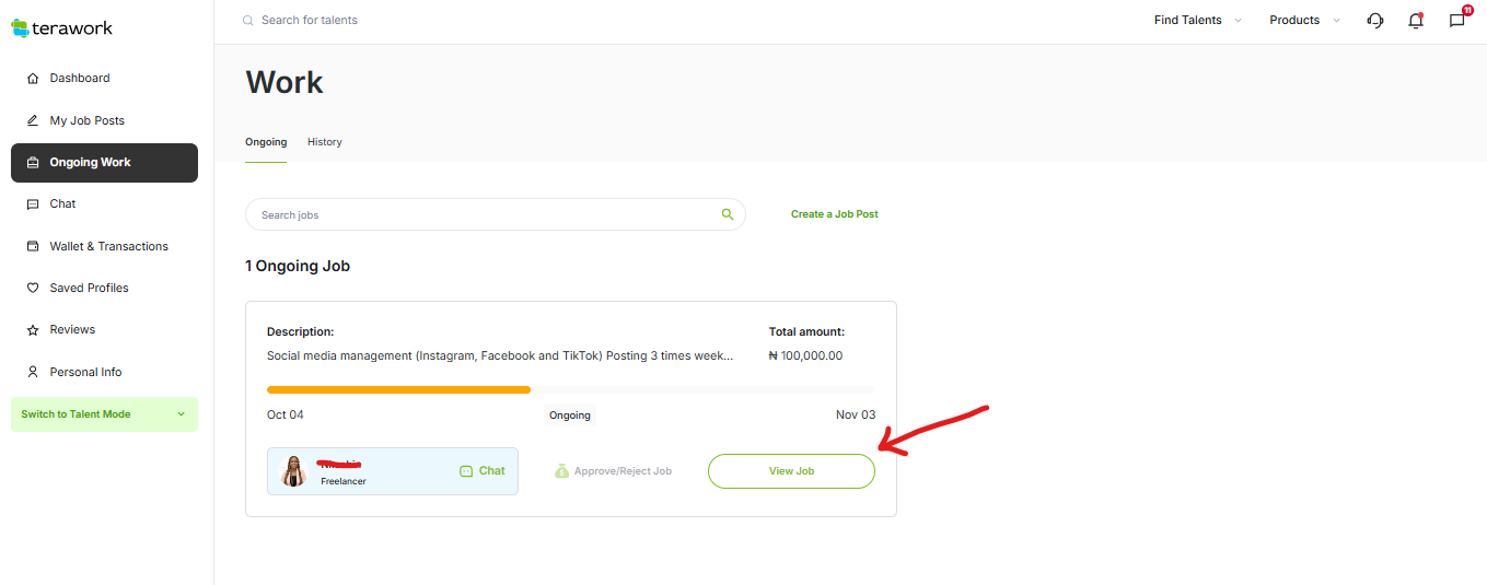 Checking Work Details. Step 1: Log in to your TERAWORK Freelance Dashboard. Step 2: Locate and click on “Ongoing Work” on the left side of the screen, then click “Ongoing.”