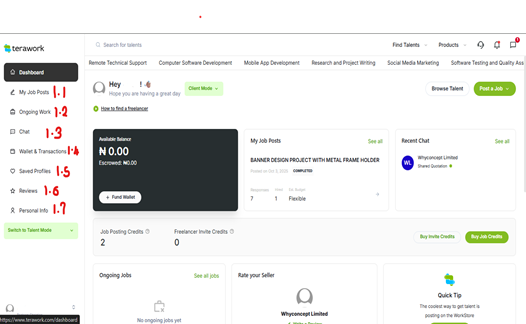 1.2. Ongoing Work: You can view and manage all your ongoing work with freelancers you’re currently collaborating with, as well as view the history of past jobs you’ve completed.