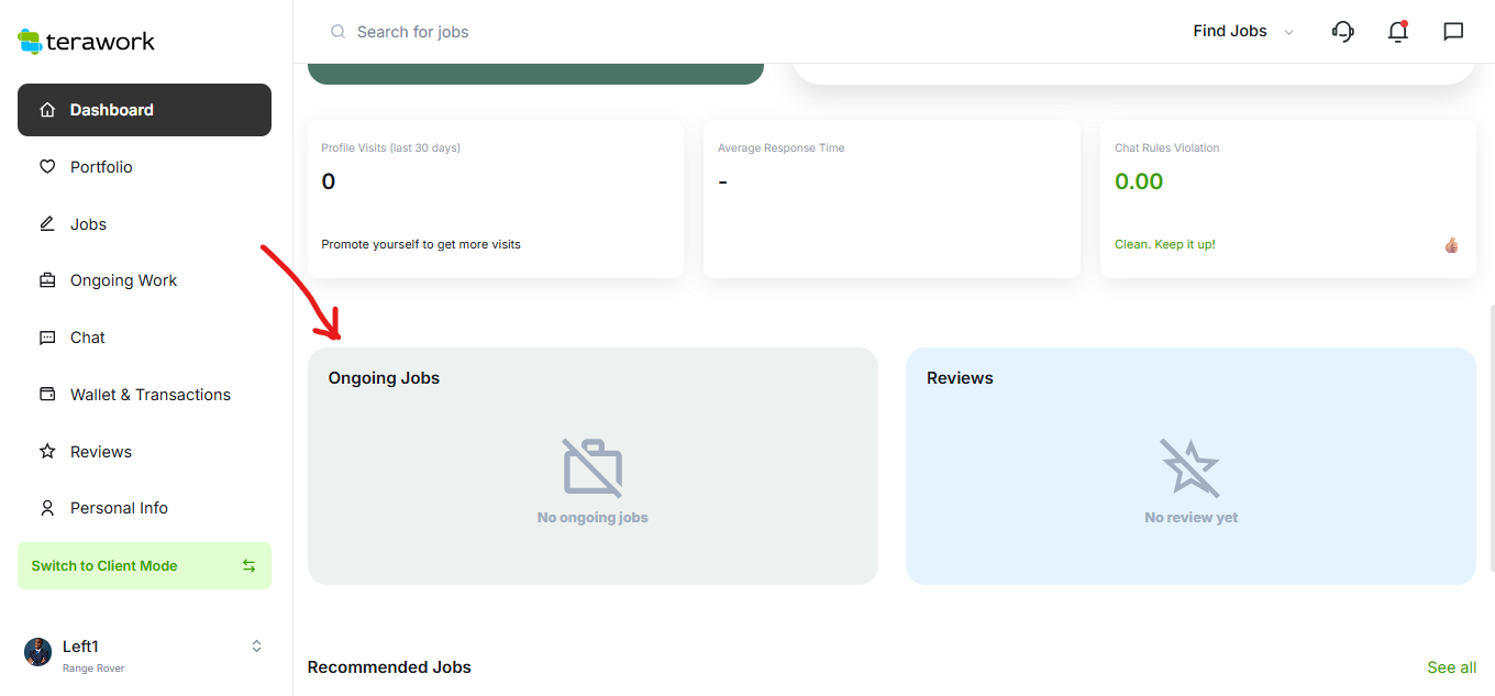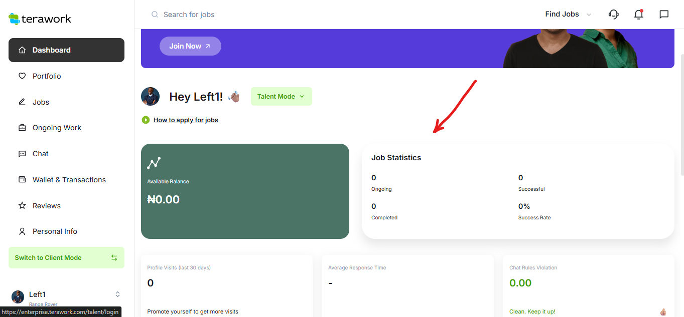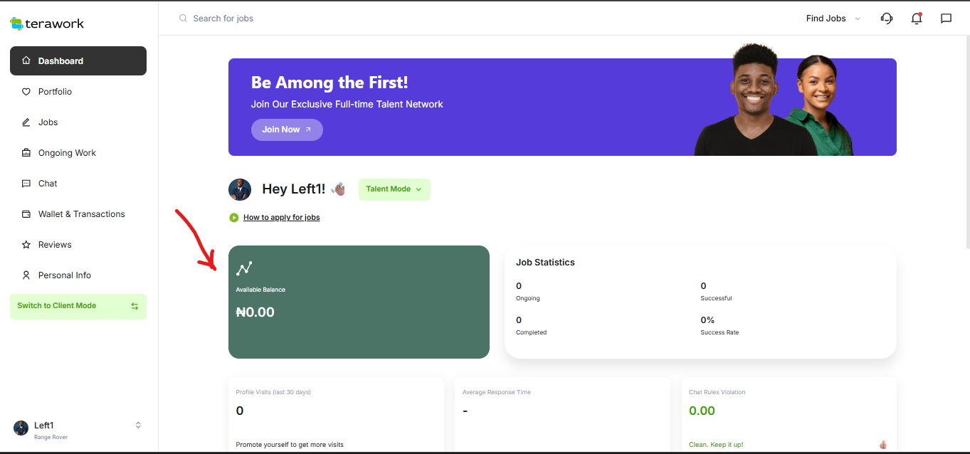 1.1. Available Balance: This section shows the total amount you’ve earned that is currently available for withdrawal. Funds will appear here once a client has approved a completed job and TERAWORK has released the payment.