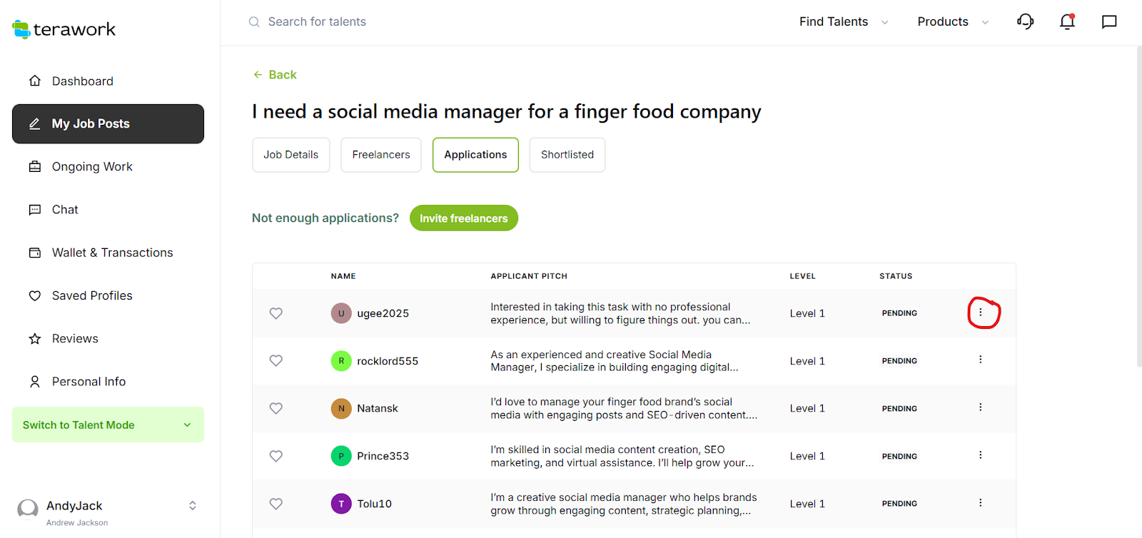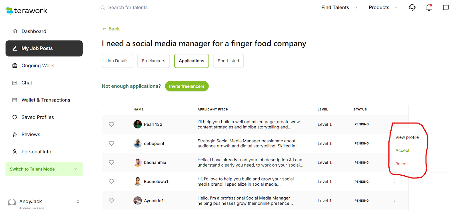 Step 3: Click on the three-dotted icon on each profile to accept, reject, or view the freelancer’s profile.