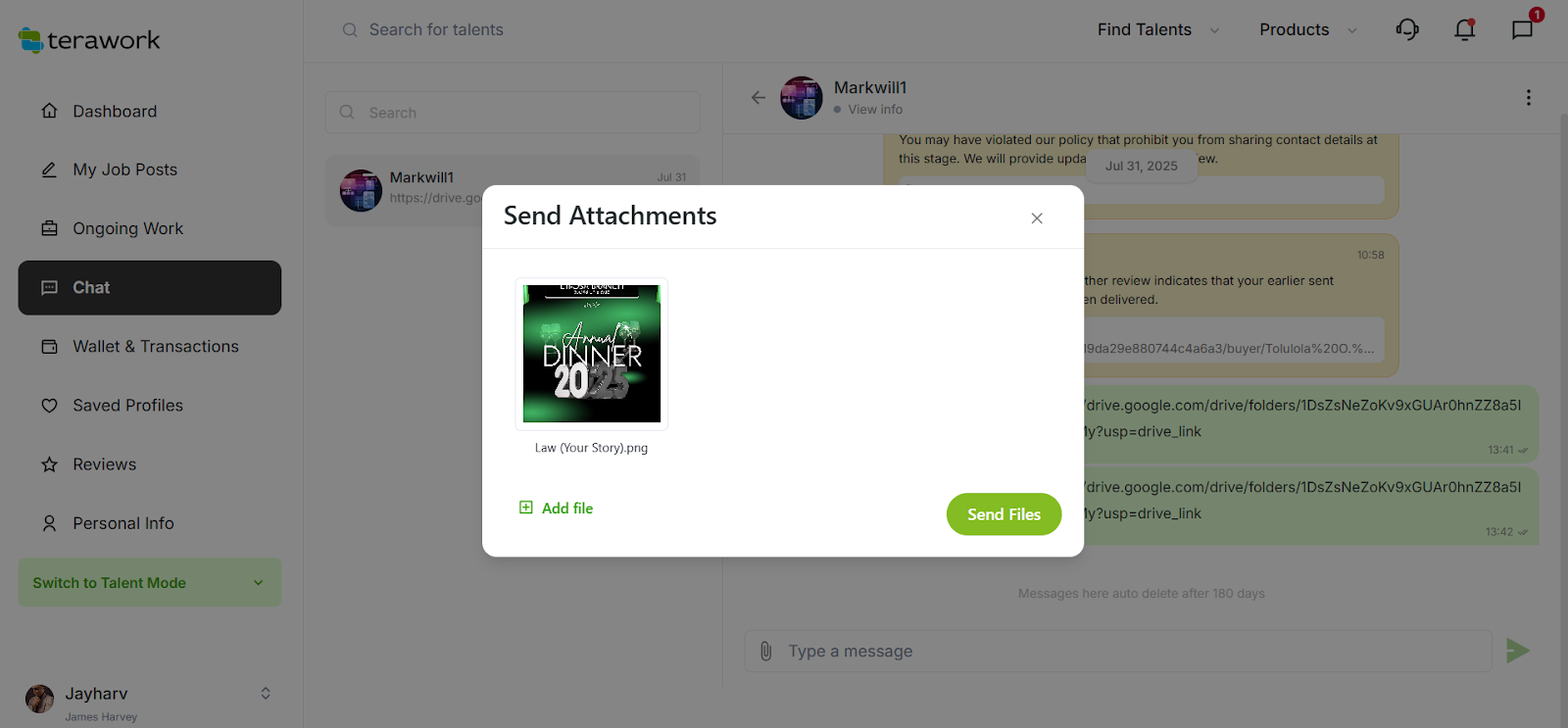 You can send media or documents to a freelancer while chatting about your project.Step 1: Go to the Chats section for the specific buyer and click on the Attachment button.