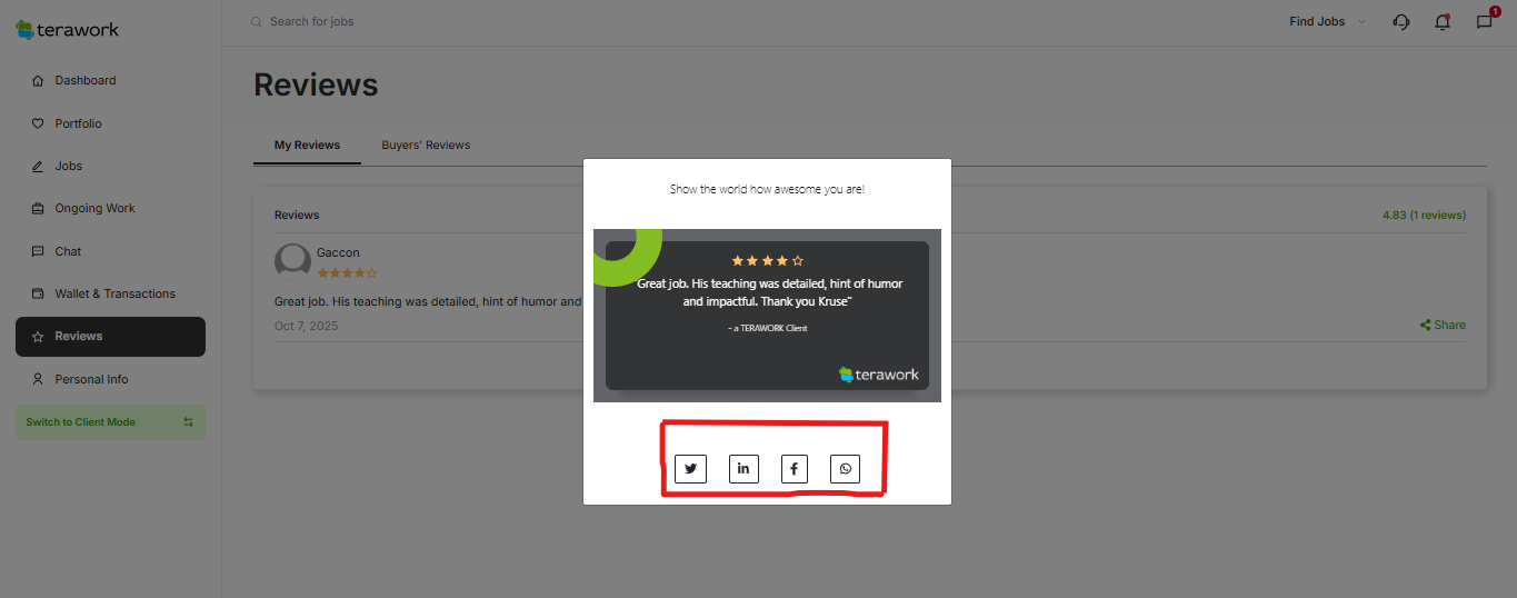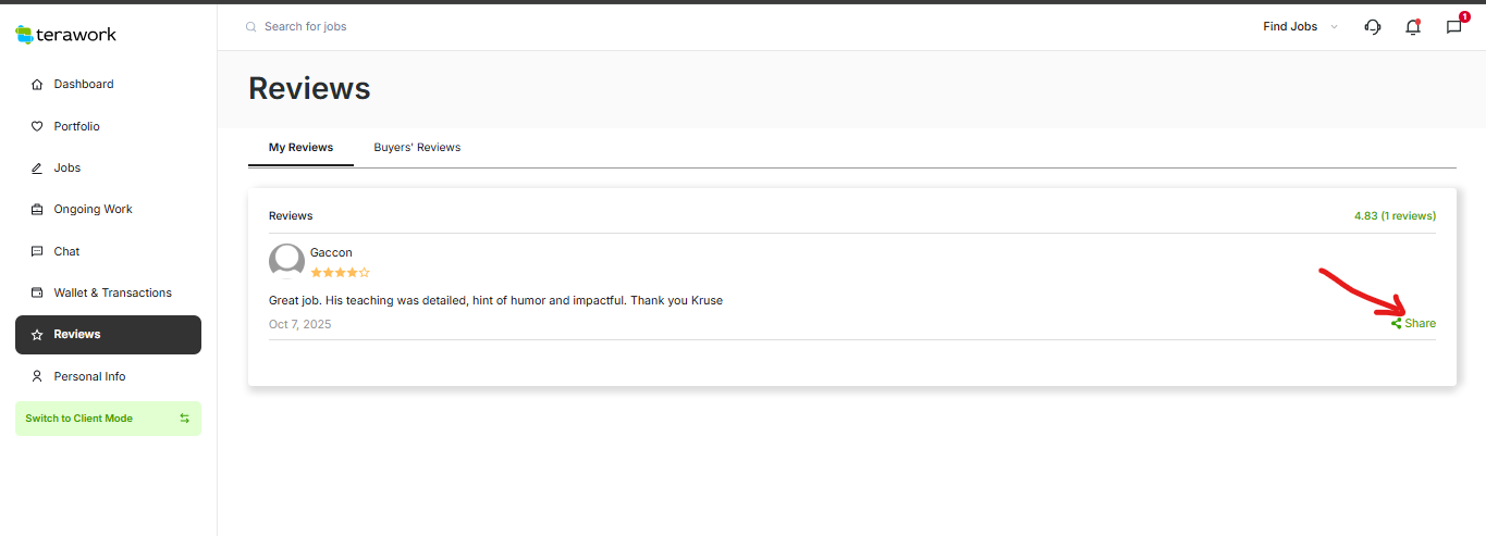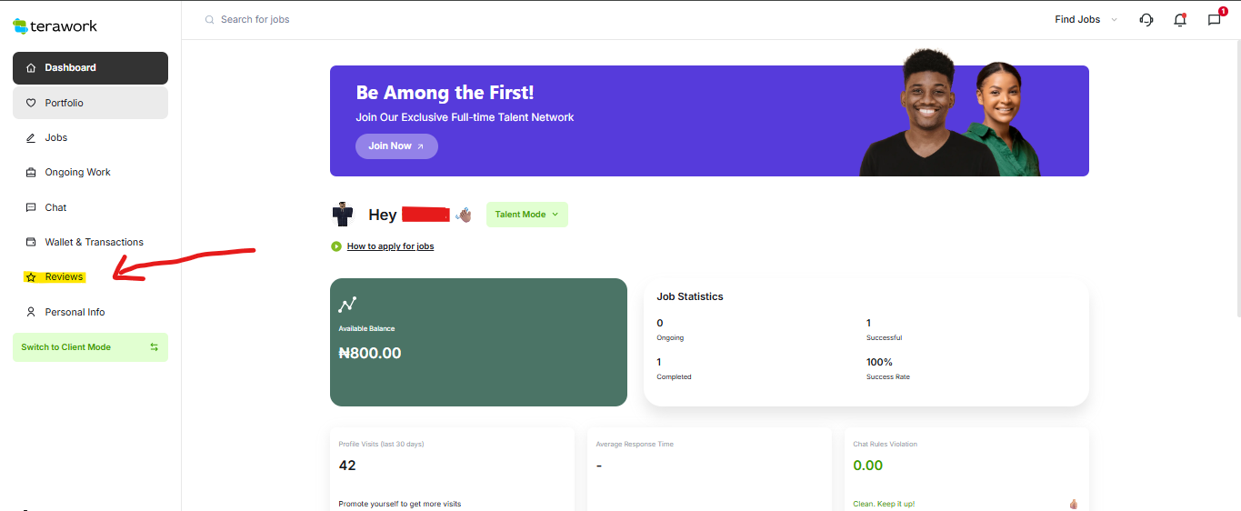 Step 1: On your freelance dashboard, locate and click on the “Reviews” option at the bottom-left corner of the screen.