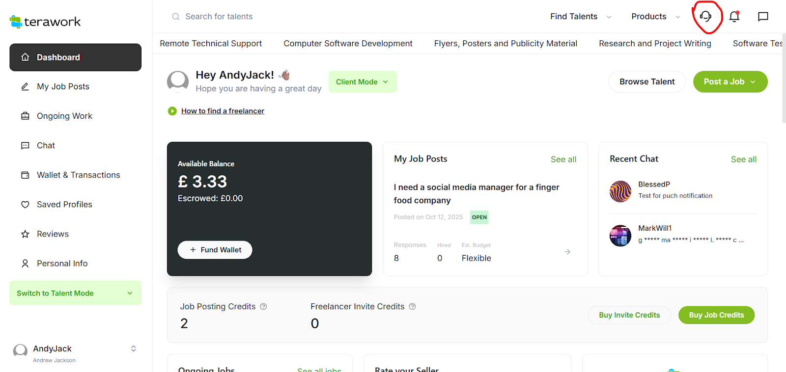 Step 1: At any point while using the platform, click on the Support icon in the top corner of the screen.