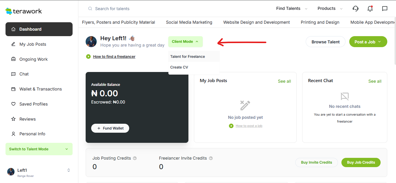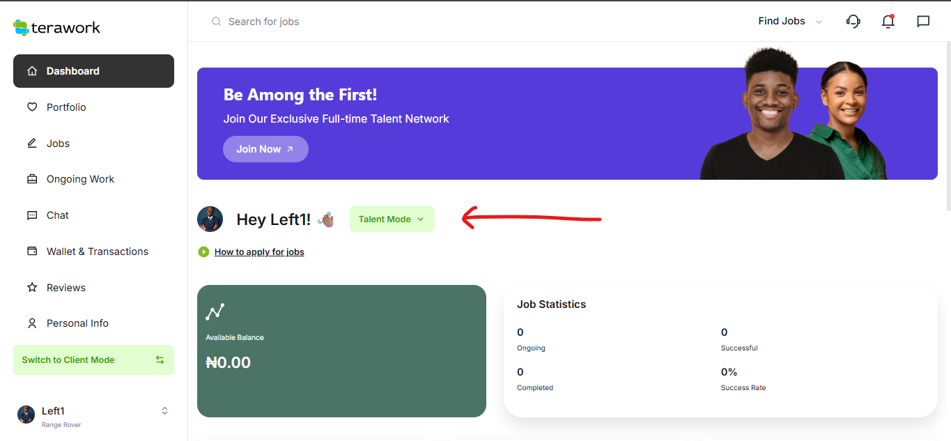Step 5: The Freelance dashboard will notify you that you are in “Talent Mode,” confirming a successful switch from “Client Mode” to “Freelance Mode.”